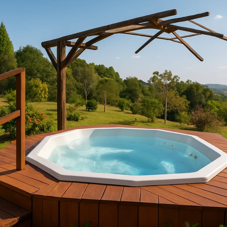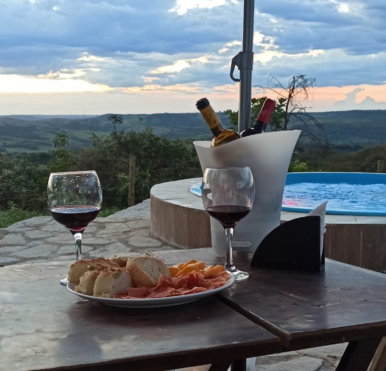 Da área externa da nossa pousada, você tem acesso direto a um espaço pensado para relaxar: piscina, ofurô e um mirante exclusivo para contemplar um pôr do sol inesquecível. Um ambiente harmonioso e elegante, ideal para quem busca conforto, bem-estar e momentos especiais.